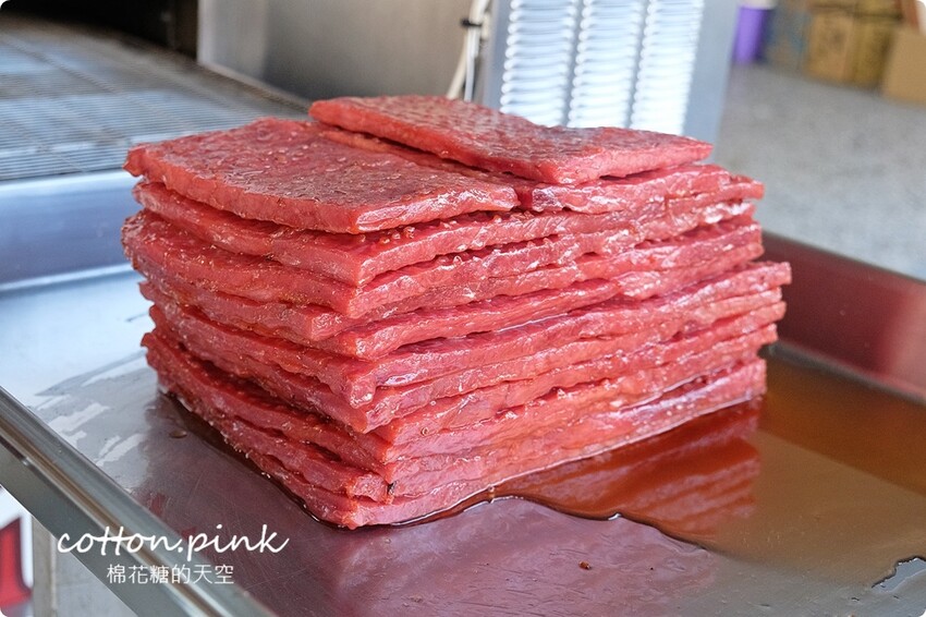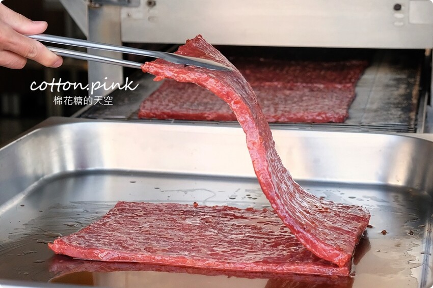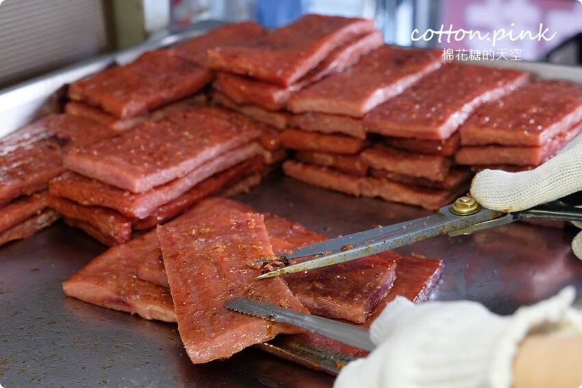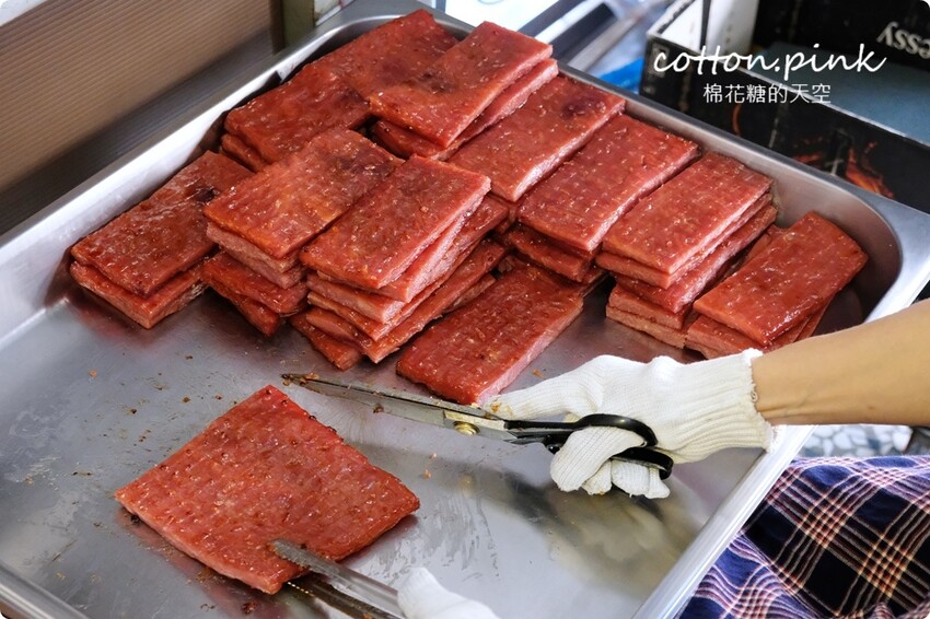 老闆一邊夾起厚厚的肉乾放進特製的烤箱裡,肉乾跑過一輪~高溫讓肉乾好吃到冒泡!老闆娘在另外一邊就得馬上把焦掉的部位去除,接著馬上把肉乾分切成小片,老闆娘說每到逢年過節~滿滿的訂單他可能要直接坐在位子上一整天!