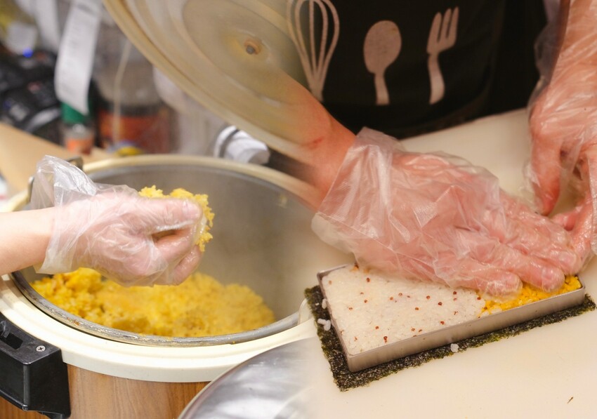 ▼半開放廚房可以清楚看到料理過程,除了乾淨衛生的環境一覽無遺,更發現店家使用甘甜泉水煮熟越光米,讓米粒軟硬適中保留的米香。