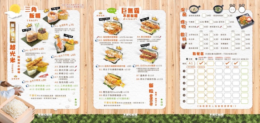 【 不握松飯糰】餐點以飽足感的米食為主,有巨無霸不握飯糰及三角飯糰系列,同時提供炸物、湯品和飲料等選擇,價格位於40元~135之間,可以依照喜歡升級配料更豐富,而且內用不會酌收服務費。
