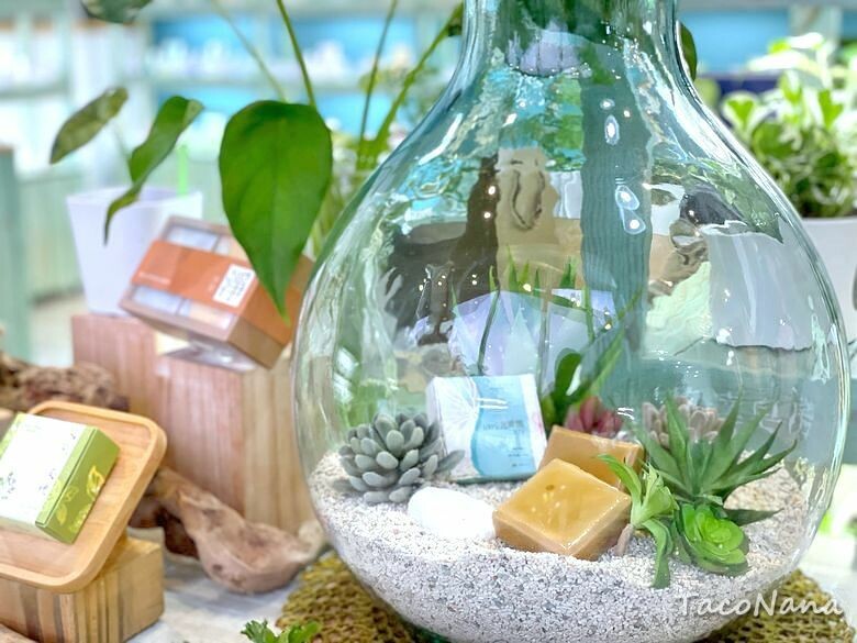 展示空間裡有個大玻璃瓶,原以為是裝飾品,解說後才了解原來裡面的皂是塊老皂,製作日期是2000年,距離現在也有20年了,居然還可以使用,而且裡面產生的甘油,據說也是相當珍貴。