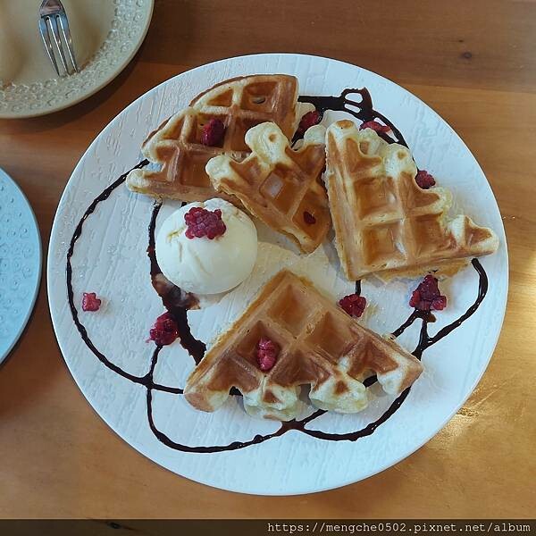 鬆餅外面酥脆裡面又QQ的有嚼勁,配冰淇淋加莓果酸甜不膩,吃飯配上窗外落羽松景色讓人心曠神怡。