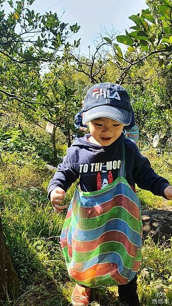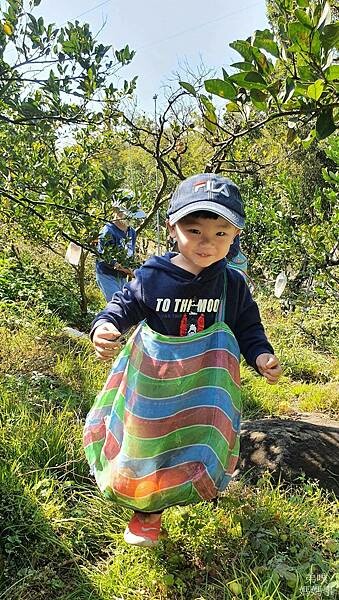 和孩子一起採橘子,算是這趟最重要的事,不過這張照片是錯誤示範,正確採橘子要用剪刀喔!!