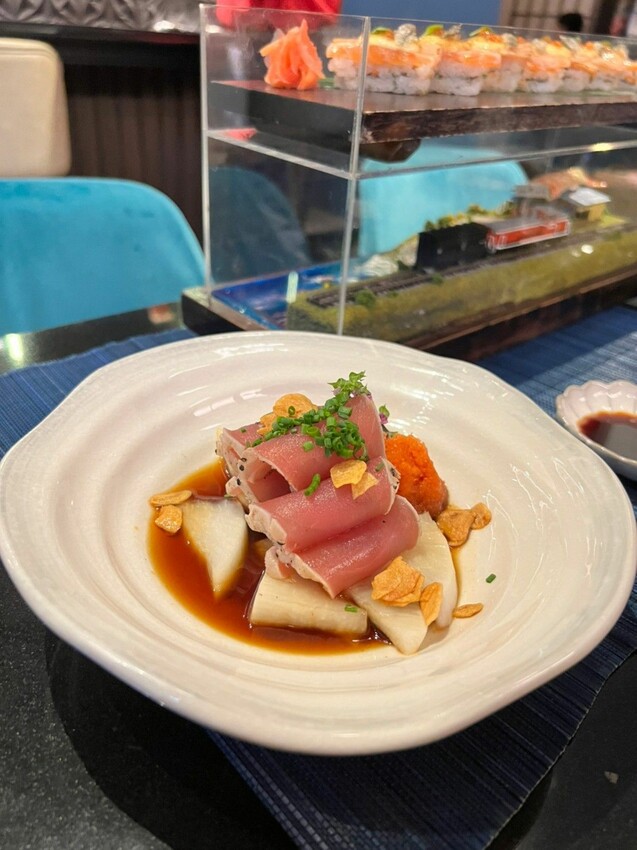 切成薄片的紅甘魚非常鮮嫩肥美!搭配底下的橙醋醬非常清爽!