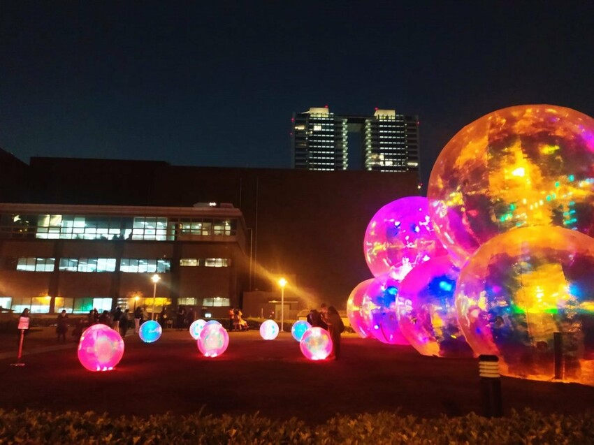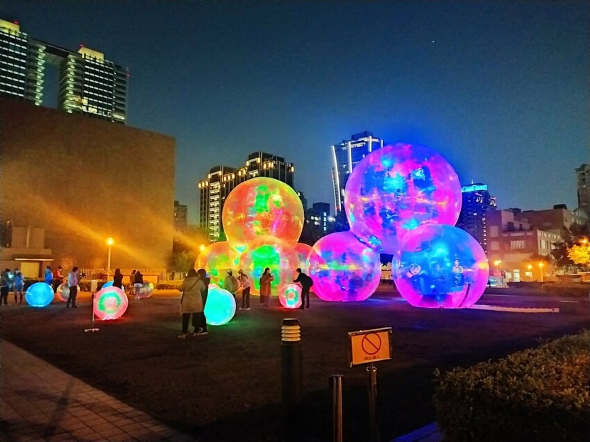 巨大的泡泡球會隨著不同光影的投射,呈現出五顏六色的光影變化