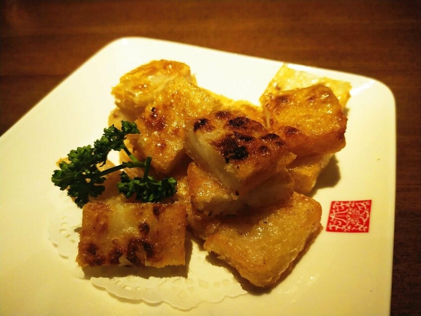 招牌蘿蔔糕$75,表皮炸得金黃,外脆內軟的口感沾著蒜蓉醬油就很好吃