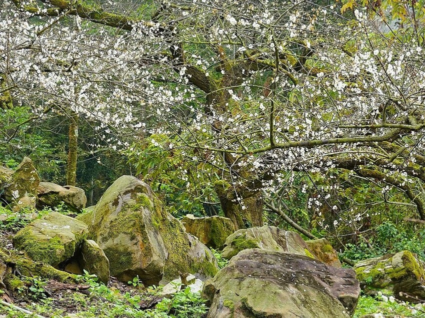 還有不少人像這對賢伉儷一樣坐在梅樹底下的大石頭拍照