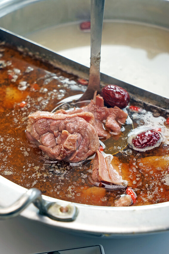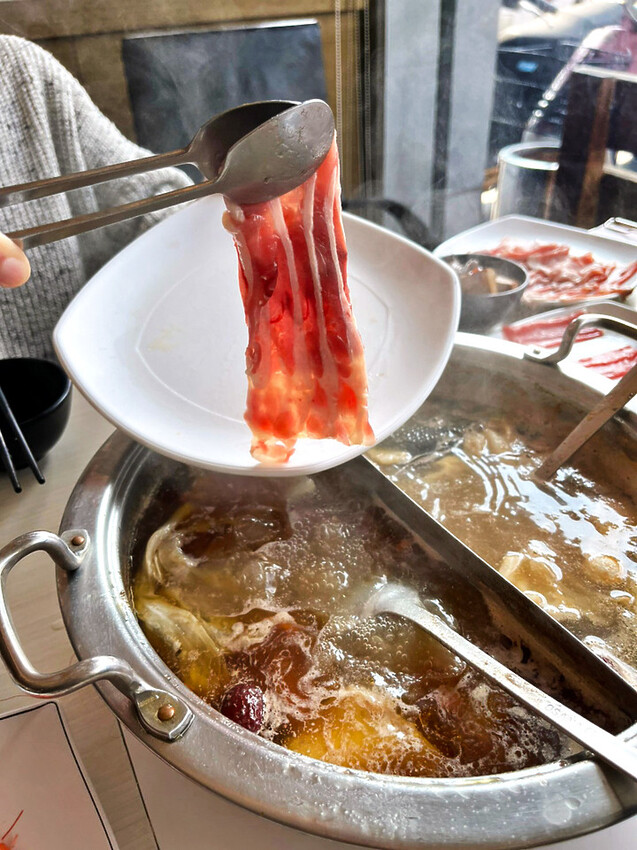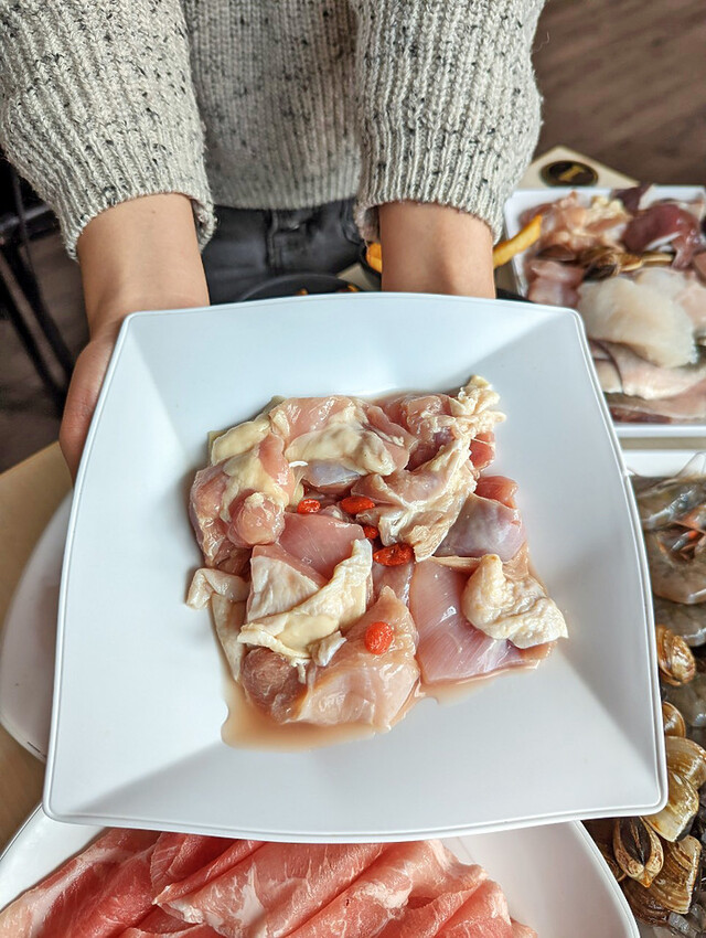 原本要點麻辣鍋底,服務人員說現在有限定口味薑母鴨,當然要吃看看呀!湯頭是濃郁的麻油香,和薑片一起煸炒,加鴨骨熬製,喝起來清甜順口,讓身體很暖