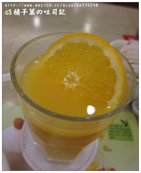 最後飲料部份的果汁是柳橙汁。送上來時~裡頭還沉了一片柳橙片讓我滿驚訝的,