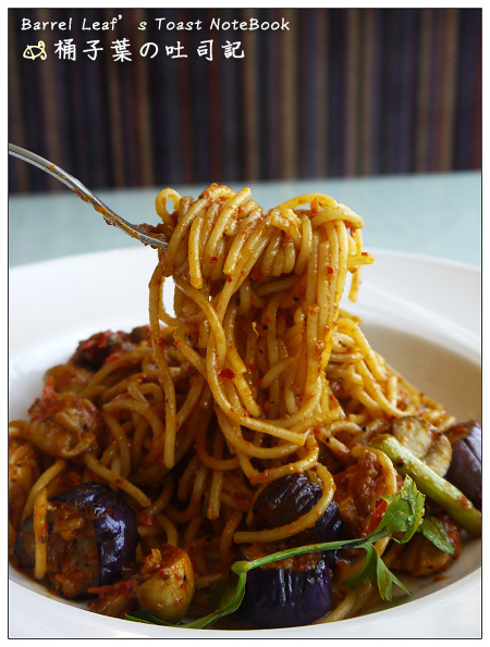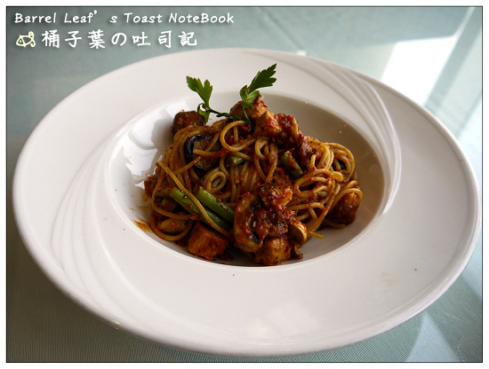 除了小雞肉塊之外~還有滿多的茄子與少許蘆筍加入,茄子部份有軟部份沒有很軟,