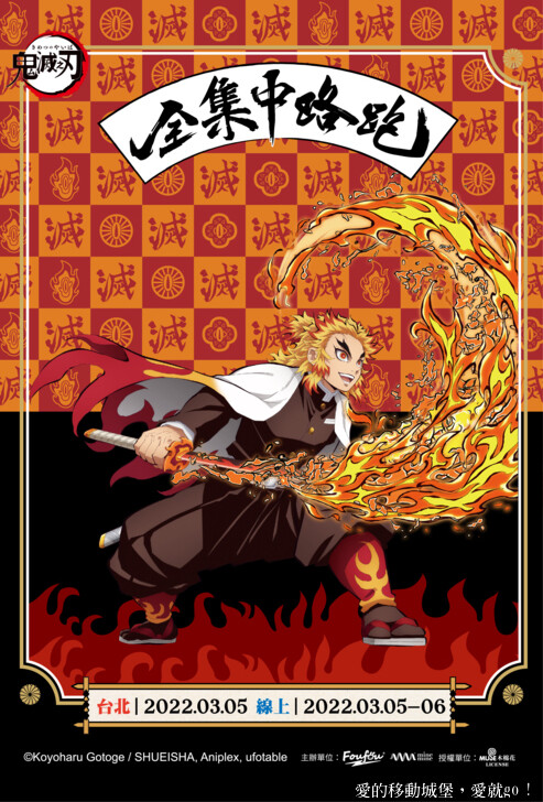 「鬼滅之刃全集中路跑」又來了2019年超人氣漫畫《鬼滅之刃》動畫播映在全球造成鬼滅炫風,2020年《鬼滅之刃劇場版 無限列車篇》全球票房大破4.74億美元,在台上映更創下6.3億台幣票房、兩百萬粉絲感動落淚,榮登台灣影史票房前十名。而巡迴北中南的「鬼滅之刃全集中路跑」路跑活動及快閃店更廣受粉絲們好評,創下全台兩萬人齊聚路跑的紀錄!乘著《鬼滅之刃遊郭篇》動畫開播,最受鬼滅粉絲們期待的「鬼滅之刃全集中路跑」第二彈也將再次回歸,釋出了炎柱帥氣揮刀的路跑活動主視覺圖,2022年3月舉辦粉絲口碑回饋場-實體加線上路跑,入門票你搶到了嗎?