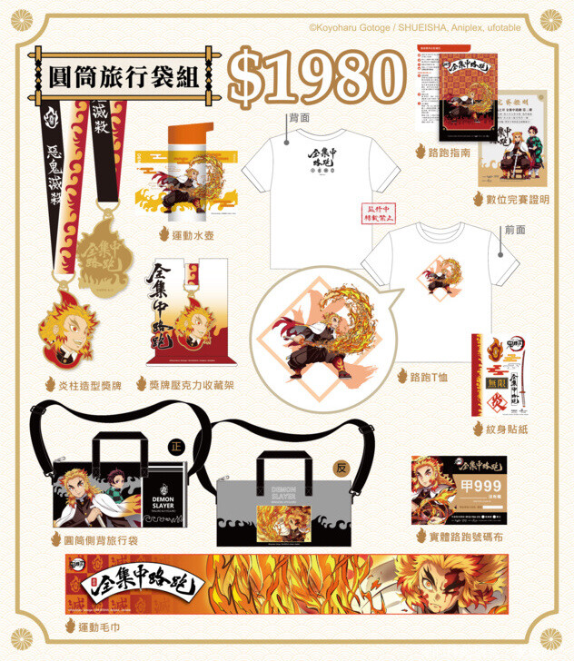 本次路跑以《鬼滅之刃劇場版無限列車篇》中的人氣主角「炎柱-煉獄杏壽郎」作為主打角色,從路跑場域規劃到路跑物資設計等都將圍繞「炎柱」主題,讓粉絲們再次回味大哥英姿。「鬼滅之刃全集中路跑」第二彈共有「路跑經典組」($980)、「運動水壺組」($1,480)及「圓筒旅行袋組」($1,980),三種組合選擇,報名線上路跑更可獲得鬼滅之刃襪子乙雙,已於12月15日起於mine mine、伊貝特、博客來,開放報名,鬼滅粉們,為了煉獄先生動起來吧,報名即將倒數了!