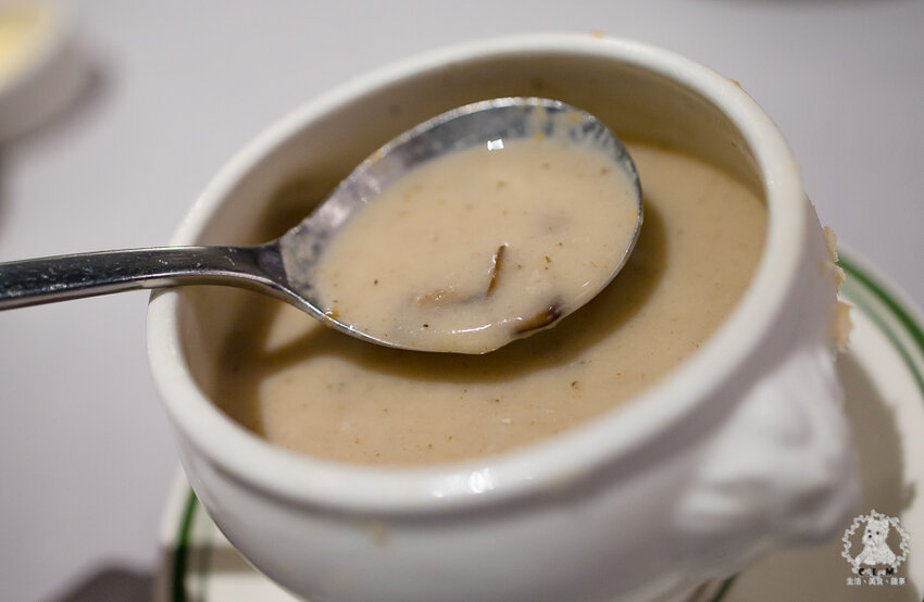 裡頭的奶油蘑菇湯非常的燙,大家要小心食用,蘑菇的香味很鮮明,奶油味不會讓人覺得膩,喝完幾口後我推薦可以加一點一旁的研磨胡椒,這個胡椒也有不同的香料,加入後整體吃起來會更加有層次,香味也更多元。