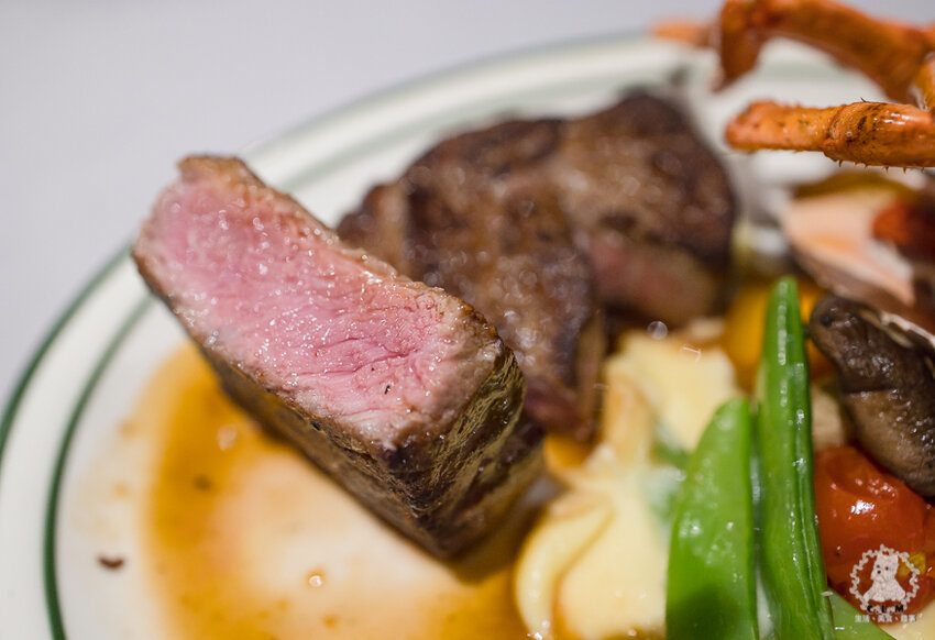 這份沙朗牛排表皮酥脆是雅室獨有的特色,肉質的口感沒有明顯的筋,油花分佈無明顯的集中油脂,吃起來略偏純肉感,咀嚼後那牛排的肉香味逐漸散發,蠻適合喜歡一點油花香氣但也怕太油的朋友,也沒有明顯的筋感,是熊仔喜歡的口感(熊仔:但我不吃牛,而且我這次沒來)。
