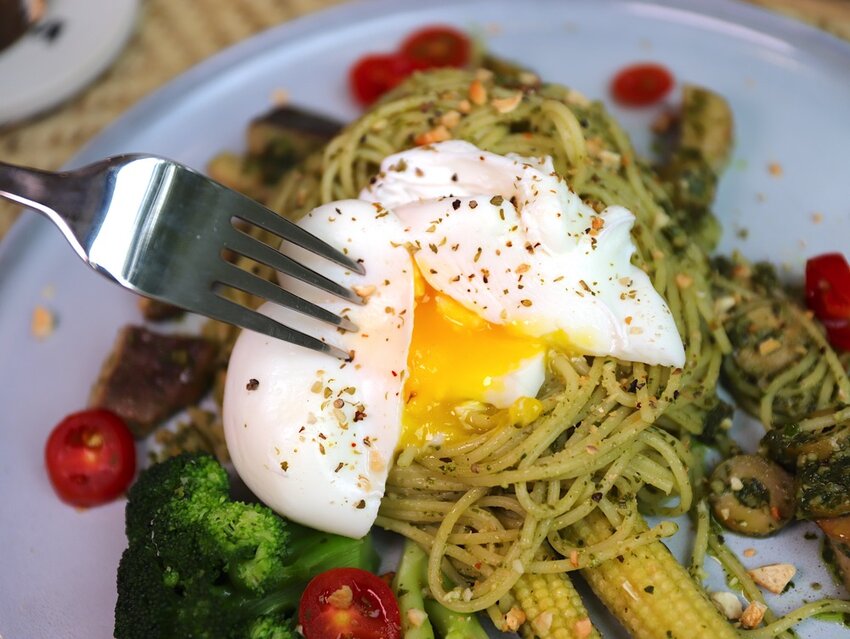 義大利麵–青醬$219 (附餐-奶酪/生菜/南瓜濃湯-3選1) (含蒜洋蔥/可全素):杏鮑菇塊、番茄、橄欖、玉米筍、水波蛋、堅果