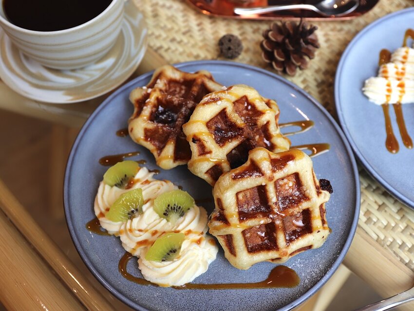 原味鬆餅$139 (附奶油、水果|加購冰淇淋 +$20元):可選 焦糖醬 或 巧克力醬