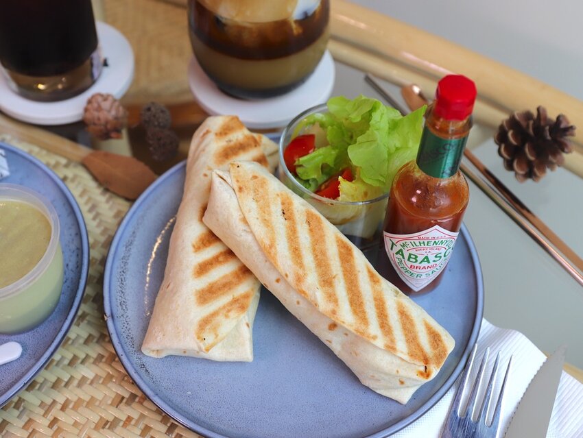 辣味捲餅$150 (附餐-奶酪/生菜-2選1):杏鮑菇丁、關廟綠竹筍丁、乳酪絲、Taco粉、Tabasco