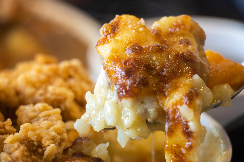 白醬裡頭的料則是有雞肉、馬鈴薯、青花椰、地瓜與紅蘿蔔,雞肉給的量也不算少,加上外頭的焗烤起司香,讓人忍不住會一口接著一口。
