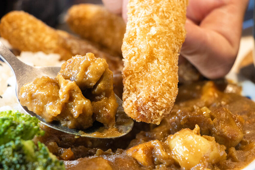 香煎雞肉的口感有嫩度帶些清爽感,搭配著咖哩吃頗為不賴,而選用後腿里肌肉製成的手指豬排是店內的人氣招牌,外層酥脆裡頭的豬排紮實有口感,好嚼也有香氣,對於愛吃肉的朋友可以像我們這樣搭配,一次就能吃到二種主餐的感覺。