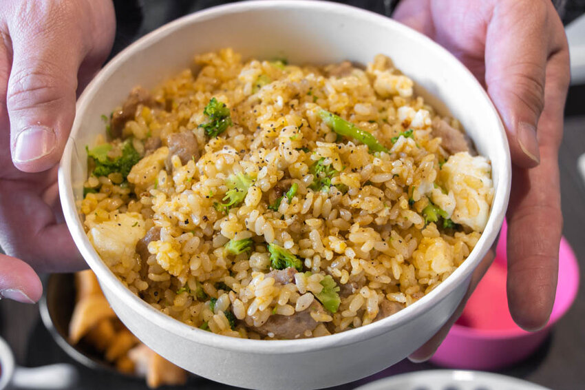 回家前我們外帶了看板上的台式小炒飯 105元,畢竟買一送一蠻吸引人的,看起來一盒的量也不算少,裡頭有肉絲、青花椰,帶著酒香與胡椒香,米粒本身裹著蛋液,入口吃起來倒是粒粒分明,鹹香到位,只是酒的香氣較為明顯!