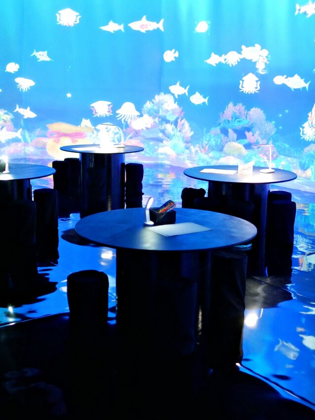 2022 鹽水月津港燈節 也首次邀請到日本teamLab 藝術團隊進駐永成戲院,運用沈浸式互動投影技術呈現讓人眼睛為之一亮的繽紛彩繪水族館,大小朋友能透過親手彩繪畫紙並掃描的方式,將作品投影在屏幕上,看著各色魚兒游來游去的模樣還真的像是置身海底世界一般,不僅如此,它還和國外的teamLab水族館連線,說不定妳的作品現在就在地球的另一端被其它人欣賞著呢!