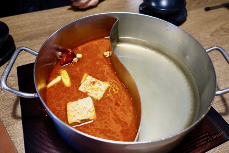 ▼我們選蔬菜鍋(一般高湯)給小孩,跟大人吃的麻辣鍋,麻辣鍋湯底鹹香辣兼具,味道豐富又有層次