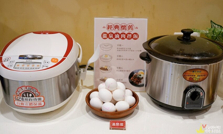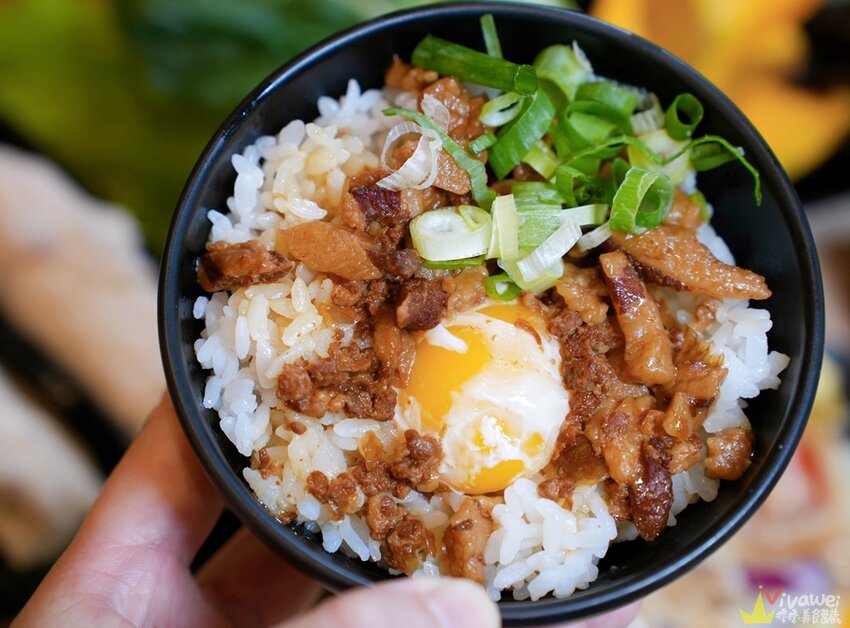 ▲經典的溫泉蛋滷肉拌飯~先將白飯中間挖個洞~將溫泉蛋打上去~最後再淋上蔥花!還可以依據個人口味添加醬料區的蔥花😋