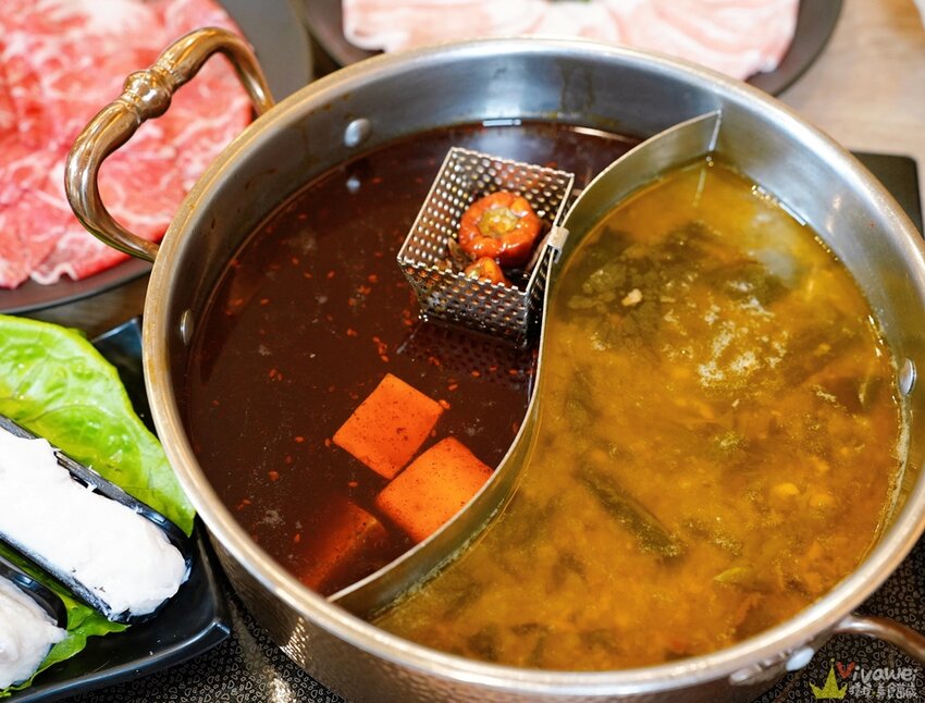 ▲火鍋湯底有四種可以選擇:分別有川府麻辣鍋、酸菜魚鍋、黃金蔬食鍋(素食可食)(不辣)、沖繩壽喜燒(不辣)!特色湯底可以四選二!敢吃辣的人~川府麻辣鍋是一定要點的啦!