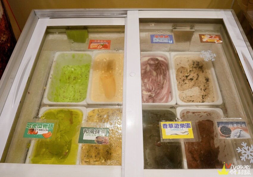 ▲明治冰淇淋有八個口味~有薄荷巧克力、草莓起司、萊姆納、布丁、哈密瓜物語、和風抹茶、香草遊樂園、特濃芝麻~