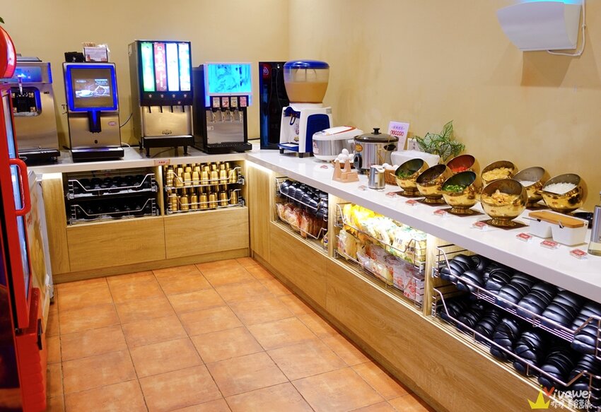 ▲飲料有罐裝的可口可樂、雪碧、竹炭水、芭樂汁、麥仔茶、麥香紅茶、草莓奶茶、生活泡沫綠茶~