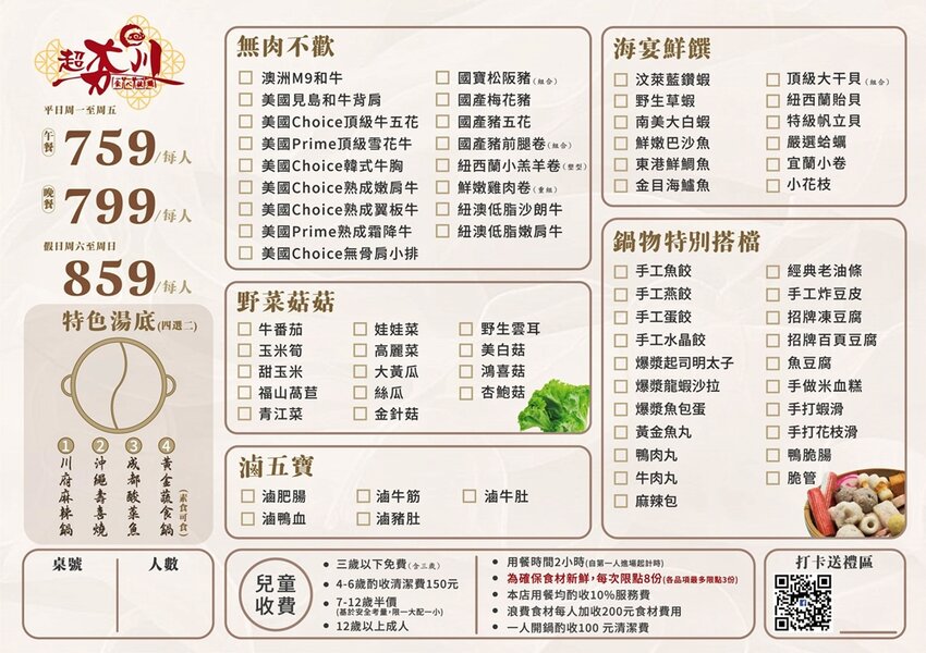 ▲週一至週五午餐759元/人、晚餐799元/人,週六週日例假日859元/人!三歲以下兒童(含三歲)免費、4-6歲酌收清潔費150元、7-12歲半價(基於安全考量,限一大配一小)、12歲以上成人收費!用餐酌收10%服務費!