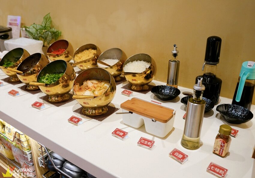 ▲醬料區的選擇蠻多的~基本款的沙茶醬、蒜頭、辣椒、醬油這邊肯定有!另外還有洋蔥丁、泡菜、砂糖、花生粉、七位粉等~都可以自行調配喜歡的口味~