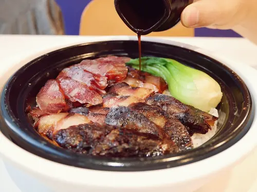 上海菜飯裡面有青江菜、培根、豬油及三種菇類,吃起來不會讓人覺得油膩,口感豐富,帶有香脆的鍋巴