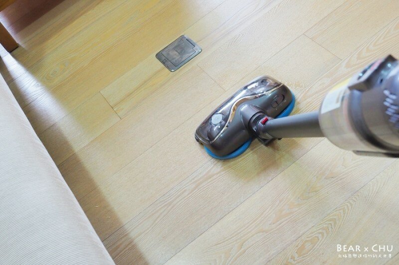 小狗T12的拖地是可以前吸後擦,等於把平常我們要先吸地板再去拿拖把擦地的工作一次完成,運轉時候抹布會用每分鐘220轉的速度快速旋轉擦地,所以清潔效果十分的顯著,這個拖地功能真的是讓迷你竹我一用就上癮,最近我們家的地板難得保持亮晶晶(笑)。
