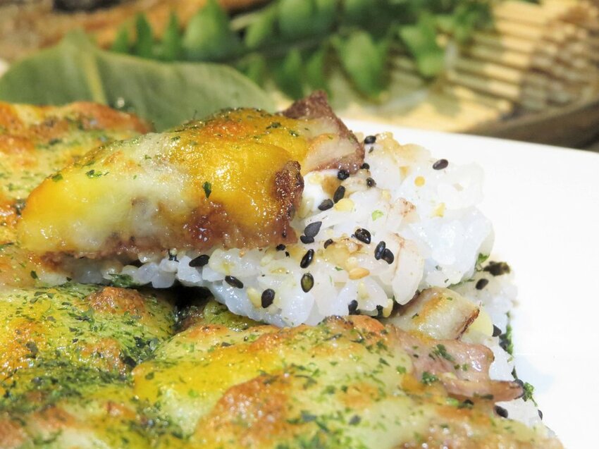 紫蘇白鰻燒有別於蒲燒鰻的製作手法,直接燒烤後刷上獨門的特製醬汁,鹹甜的醬汁和厚實的燒鰻蓋在軟Q的米飯上,加上一點鮭魚卵的搭配熱熱的入口,咀嚼間每一口都很精彩。