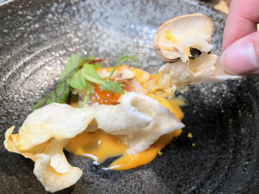 將堅持使用烘乾法製成的椪皮與細緻的蟹肉一同沾底層的醬汁食用,不論是口感還是香氣的層次感都非常豐富,能夠品嚐到些許海膽的鮮香,淡淡的鹹蛋黃使蟹肉形成強烈對比。非常有創意。
