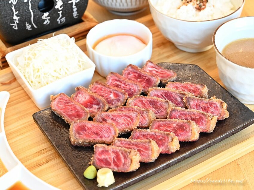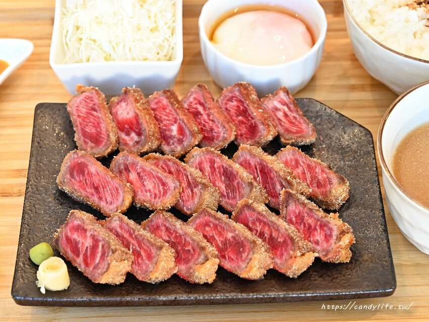 來吃嵐山炸牛排當然不能錯過人氣招牌炸牛排囉,這裡的炸牛排有兩種,分別是炸霜降紐約客牛排及炸特選級翼板牛排,如果比較喜歡吃軟嫩口感的朋友可以點炸霜降紐約客牛排,旁邊還會附上白飯、溫泉蛋、味噌湯及高麗菜絲,除了溫泉蛋,其他都可以免費續加唷