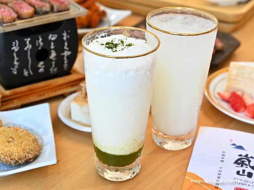 嵐山炸牛排除了草莓系列甜點,飲品也多了抹茶拿鐵,採用靜岡抹茶粉搭配香純鮮奶,抹茶香氣濃郁,甜度雖然是固定的,不過整體喝起來不會太甜,另一杯糖糖選了優格氣泡飲,酸酸甜甜的滋味,清爽又解膩