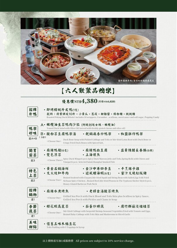 四人套餐(3180元)與六人套餐(4380元),大家也可以參考看看,四人價格就可以吃得到片鴨與經典小菜可以選擇,份量來說四個人來吃也是挺飽的。