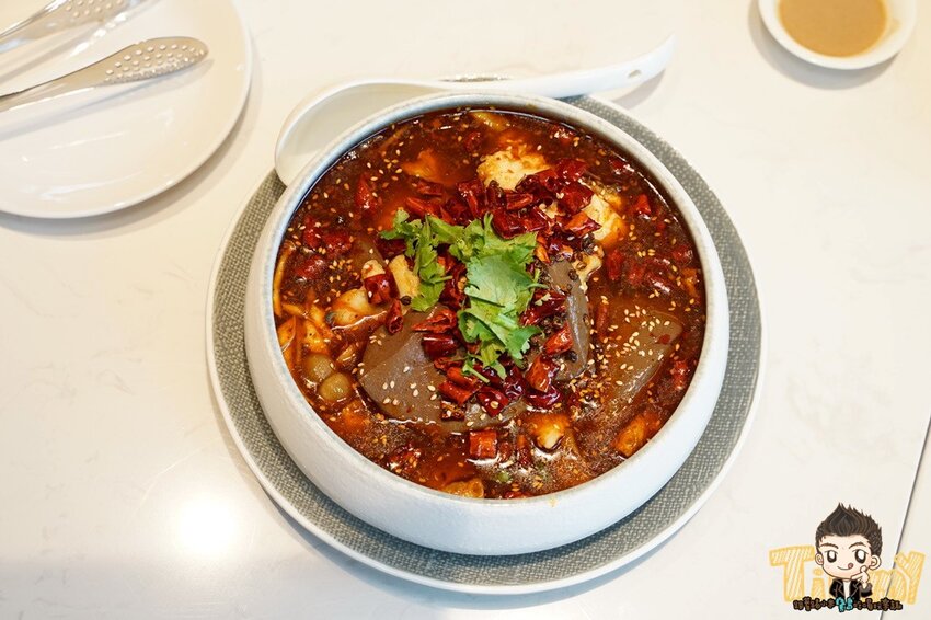套餐裡面還有招牌鍋物二選一,分別有麻辣水煮魚與老罈金湯酸菜魚,我們喜歡吃辣,所以選了麻辣水煮魚,非常大一盤上桌真是大器。