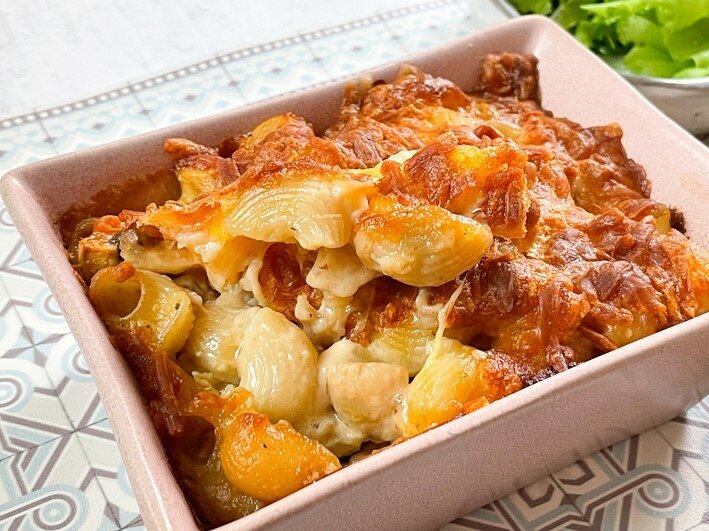 食材:60G小田螺麵. 5g奶油,100G雞腿肉丁,1/4顆洋蔥丁,一瓣蒜末.蘑菇丁適量 (也可以換花椰菜或是小玉米),三大匙白醬,25ML鮮奶油,一片Emmantal,黑胡椒少許,焗烤起司
