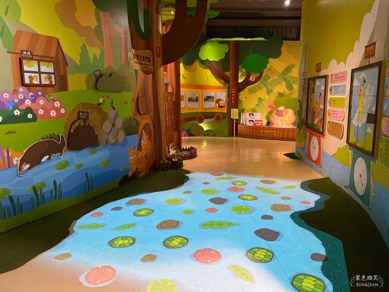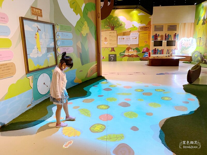 這段路上的地板有電子投影,是可以互動的哦,投影的內容有烏龜、石頭、葉子等,只要用腳踩就有不同的變化