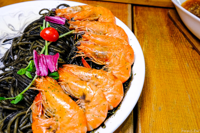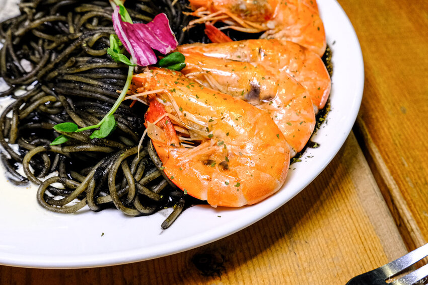 墨魚醬八隻蝦義大利麵,大理石紋路鮮蝦美拍
