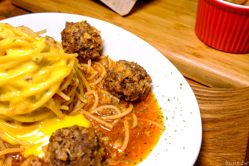 然後這份「秘辛起司牛肉丸瀑布義大利麵」同樣是這次的新品項紅醬義大利麵之一,自家熬煮的番茄肉醬配上牛肉丸,再淋上香濃起司醬。