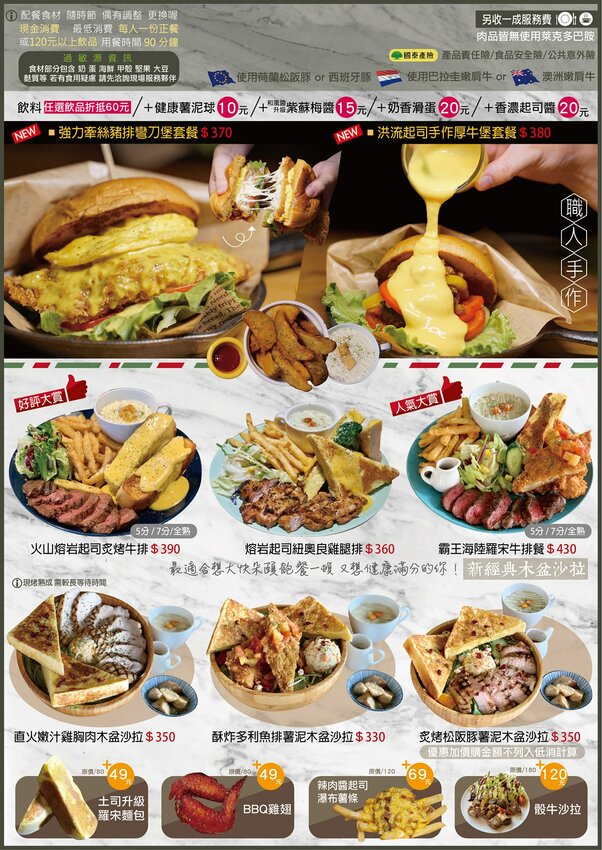 最新一期MENU菜單,除了有非常受歡迎的火山熔岩起司炙烤牛排、大份量木盆沙拉之外,加入了洪流起司手作厚牛堡套餐、強力牽絲豬排彎刀堡套餐。