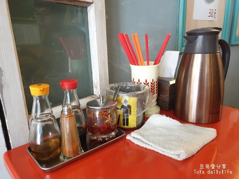 ▲每個桌上都有基本的調味料,可以依照喜好自行添加;還有筷子、衛生紙、小垃圾桶,以及開水
