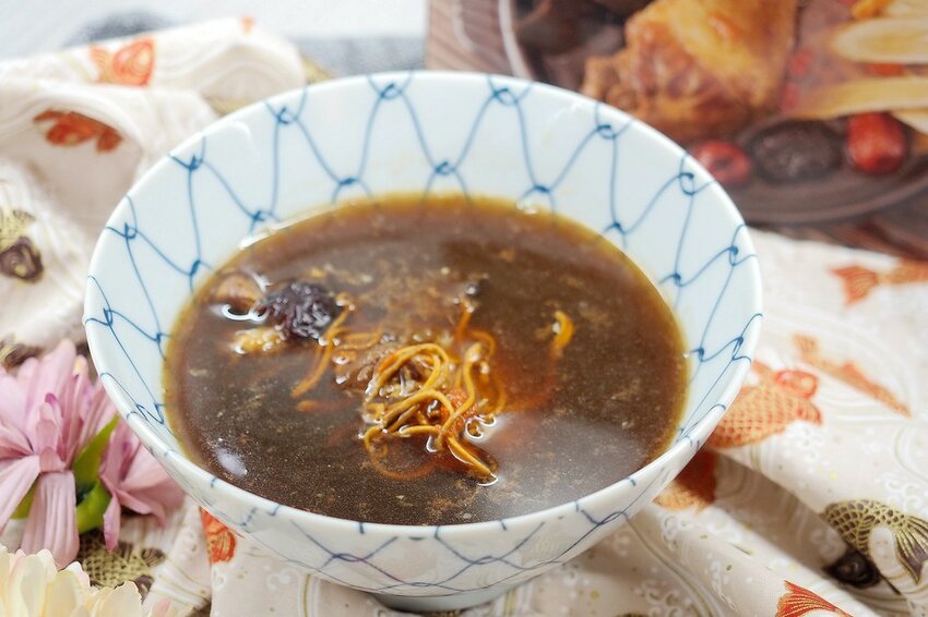 而且可以看到一整隻的雞腿,黑棗,蟲草花.枸杞等中藥材