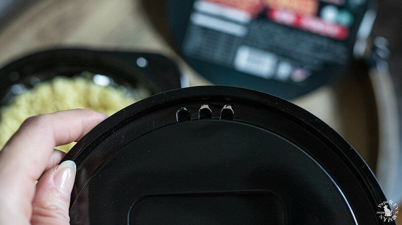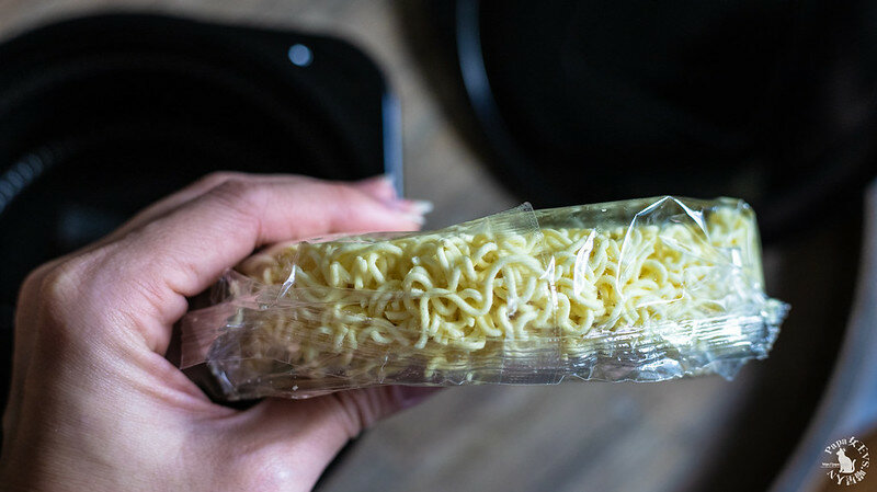外部塑膠封膜取下後會發現麵碗蓋上有個洞,是讓人倒熱水出來的,這款是乾拌麵!