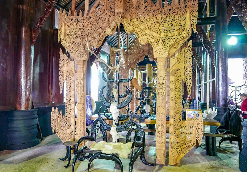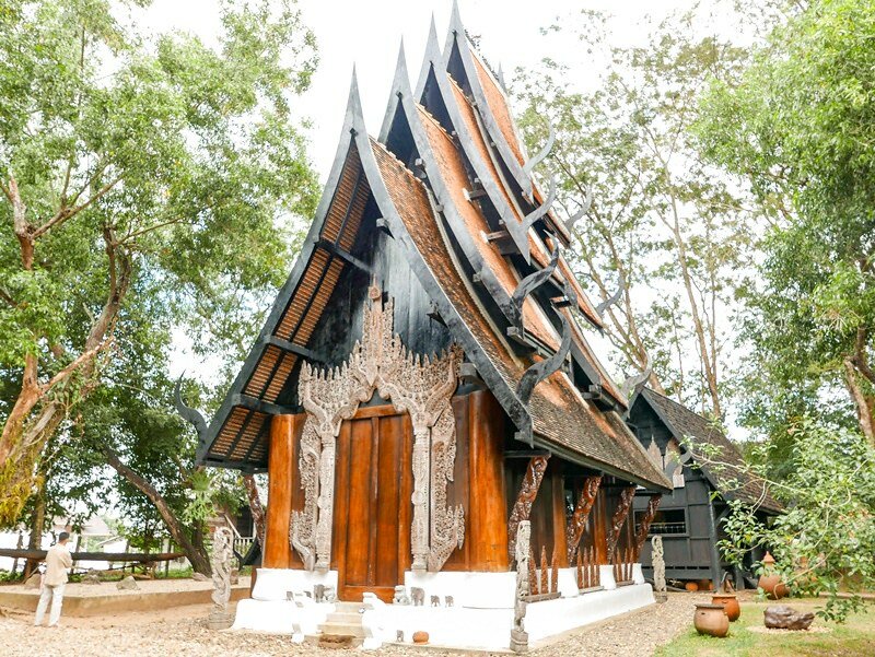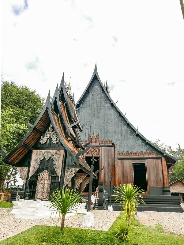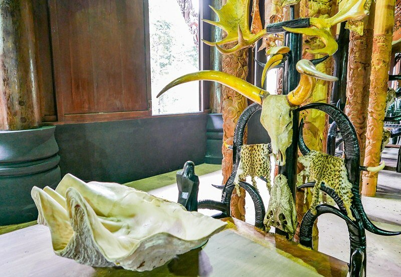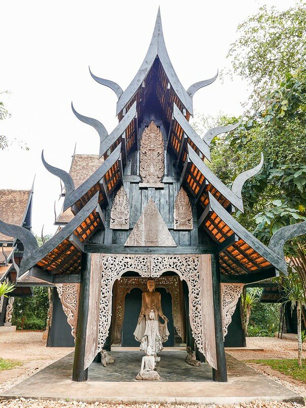 眼前的黑不是黑,你說的白是什麼白,人們說的天空藍...咳該該,來到清萊我就想來上這一段,在國人的旅遊中清萊的代表性景點是「白、黑、藍」三座廟,說來有趣這三座廟只有後來的藍廟算是廟宇,今天的主角本質上比較像博物館,因為建築物多半以黑色為主色,裡面有放著許多動物的骨骸,於是有了「地獄博物館 」的稱號。