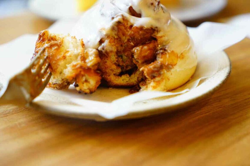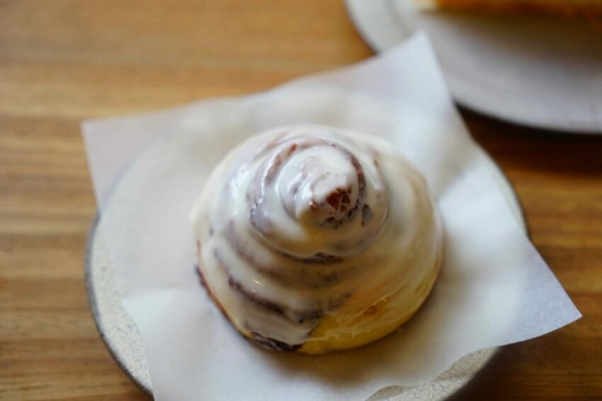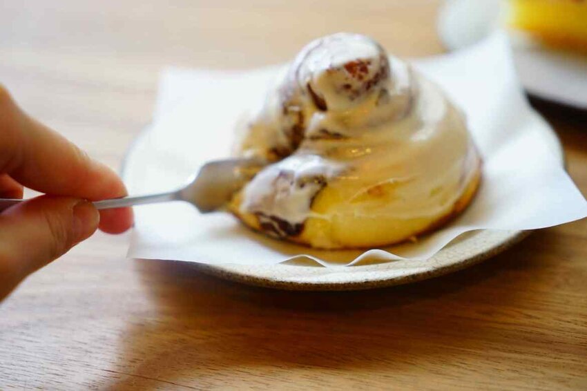 肉桂捲的外層會淋上濃郁的奶油醬,肉桂捲中間是屬於濕潤的,外層雖然淋上了乳酪醬但還是吃得出它是酥脆的,甜度適中,這就是一個非常值得一嚐再嚐的肉桂捲。