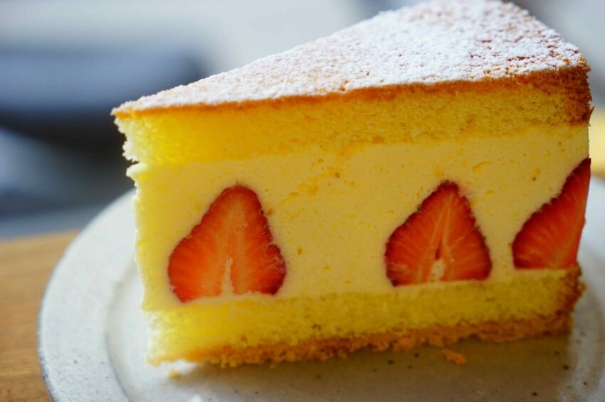 蛋糕體的部分比起日式戚風蛋糕來說偏乾一點、紮實一點,不過整體吃起來還是鬆軟的。